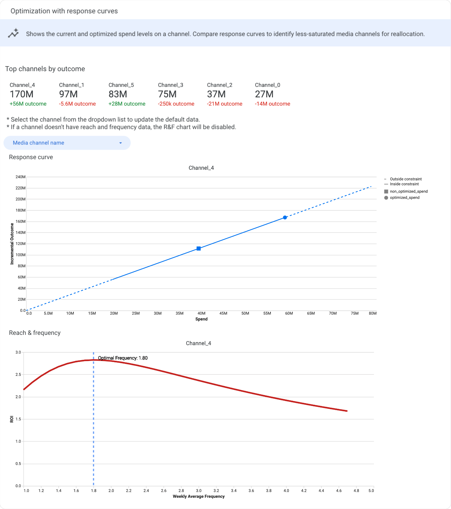 图 19. 图表显示了优化后的响应曲线以及覆盖面和频次曲线。您可以使用渠道下拉菜单指定目标渠道。