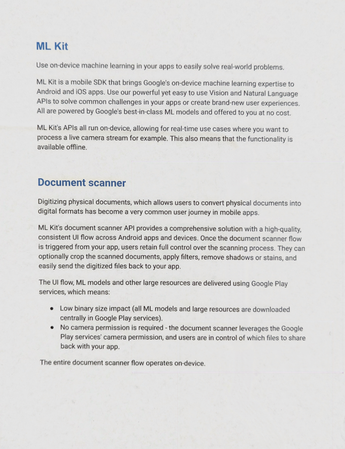 • SCANNER_MODE_FULL(デフォルト): SCANNER_MODE_BASE_WITH_FILTER モードに ML 対応の画像クリーニング機能(シミや指などを消去)を追加します。このモードでは、Google Play 開発者サービスのアップデートとともに、将来の主要な機能も自動的に追加されます。他の 2 つのモードでは、現在の機能セットが維持され、軽微な改善のみが適用されます。