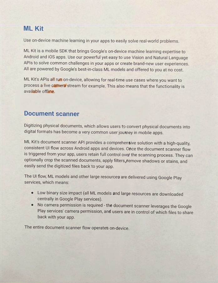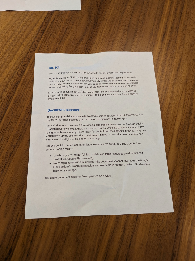أصبح تحويل المستندات الورقية إلى مستندات رقمية، ما يتيح للمستخدمين تحويل المستندات الورقية إلى تنسيقات رقمية، رحلة مستخدم شائعة جدًا في تطبيقات الأجهزة الجوّالة. توفّر واجهة برمجة التطبيقات "ماسح المستندات" في ML Kit حلاً شاملاً يتضمّن مسارًا عالي الجودة ومتسقًا لواجهة المستخدم على جميع تطبيقات وأجهزة Android. بعد بدء عملية مسح المستند ضوئيًا من تطبيقك، يحتفظ المستخدمون بالتحكّم الكامل في عملية المسح. ويمكنهم اقتصاص المستندات التي تم مسحها ضوئيًا بشكل اختياري، وتطبيق الفلاتر، وإزالة الظلال أو البقع، وإعادة الملفات الرقمية إلى تطبيقك بسهولة.