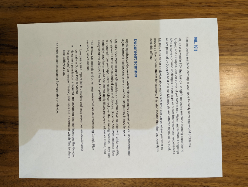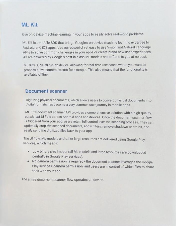사용자가 실제 문서를 디지털 형식으로 변환할 수 있도록 하는 실제 문서의 디지털화는 모바일 앱에서 매우 일반적인 사용자 여정이 되었습니다. ML Kit의 문서 스캐너 API는 Android 앱과 기기 전반에서 고품질의 일관된 UI 흐름을 제공하는 포괄적인 솔루션을 제공합니다. 앱에서 문서 스캐너 흐름이 트리거되면 사용자는 스캔 프로세스를 완전히 제어할 수 있습니다. 선택적으로 스캔한 문서를 자르고, 필터를 적용하고, 그림자나 얼룩을 제거하고, 디지털화된 파일을 앱으로 쉽게 다시 보낼 수 있습니다.