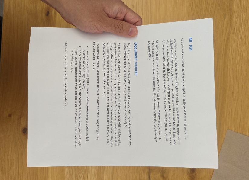 Số hoá tài liệu thực tế, cho phép người dùng chuyển đổi tài liệu thực tế sang định dạng kỹ thuật số đã trở thành một hành trình rất phổ biến của người dùng trong các ứng dụng di động. API trình quét tài liệu của Bộ công cụ học máy cung cấp một giải pháp toàn diện với quy trình giao diện người dùng nhất quán, chất lượng cao trên các ứng dụng và thiết bị Android. Sau khi quy trình quét tài liệu được kích hoạt từ ứng dụng của bạn, người dùng vẫn có toàn quyền kiểm soát quy trình quét. Người dùng có thể tuỳ ý cắt tài liệu đã quét, áp dụng bộ lọc, xoá bóng hoặc vết bẩn và dễ dàng gửi các tệp được số hoá trở lại ứng dụng của bạn.