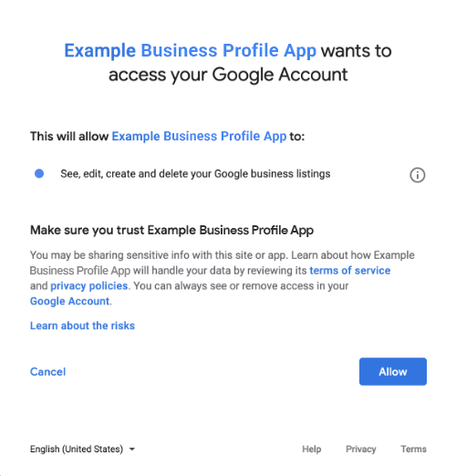 Предполагается, что пользователь уже вошел в свой аккаунт Google, разрешил вашему приложению делать вызовы Business Profile API и обменял код авторизации. Этот код в дальнейшем используется для получения токена обновления, а затем – токена доступа. Токен обновления можно сохранить в безопасном хранилище и в любой момент использовать для получения нового токена доступа. Подробнее об этом рассказывается в статье Вход в Google для серверных приложений.