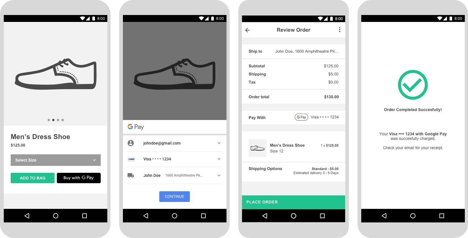 Ein Screenshot einer abgeschlossenen Integration sieht so aus: Die Integration umfasst auch die Schritte Artikelauswahl/Vor dem Kauf, Transaktion, Google Pay-Auswahl und Nach dem Kauf.