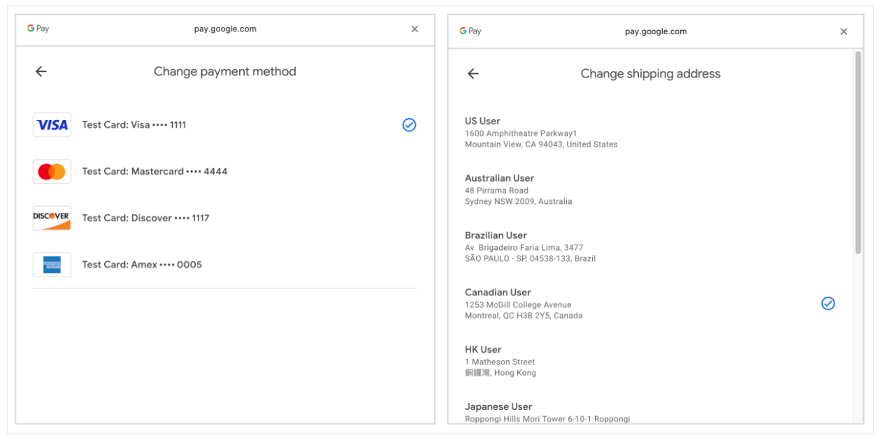 사용 가능한 게이트웨이가 있는 테스트 묶음을 사용하면 게이트웨이에서 모의 테스트 카드 묶음 대신 테스트 카드 목록을 표시합니다. 결제 명세서 흐름에서 PaymentData 객체가 생성되면 선택한 카드 값이 제공된 토큰으로 암호화됩니다. 그러면 선택한 카드 값을 게이트웨이의 테스트 환경에 전달하고 예상 응답을 수신할 수 있습니다.