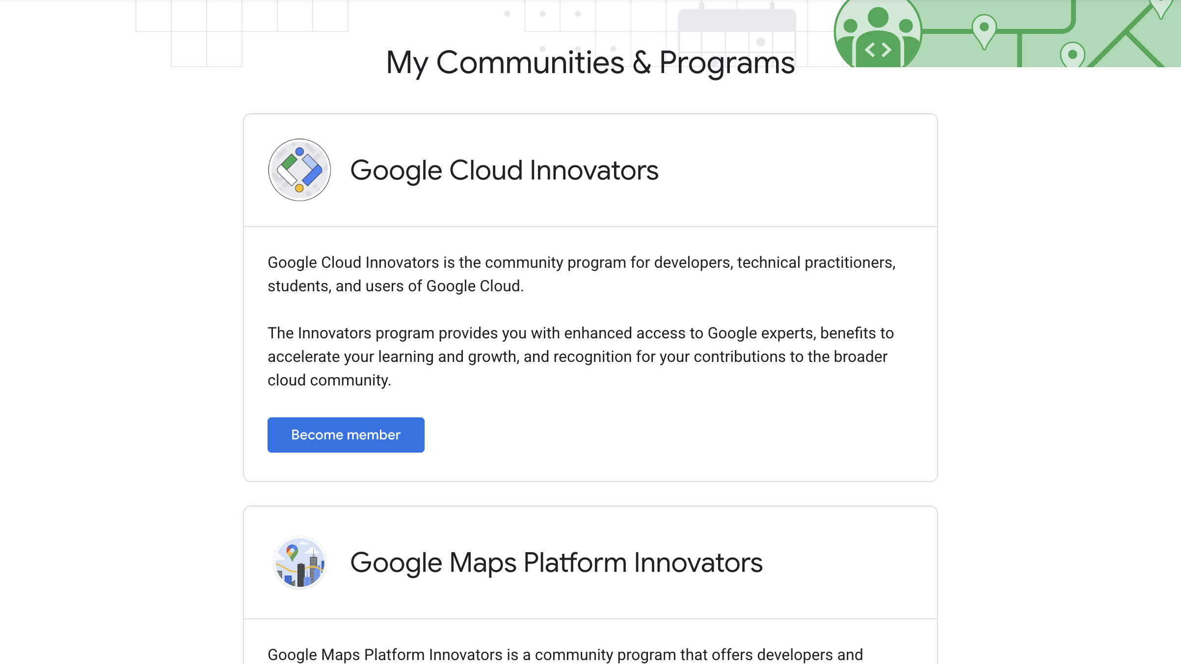 Únete a grupos como Google Cloud Innovators y Google Maps Platform Innovators. Comparte recursos, establece conexiones y crea un perfil público para compartirlo con otras personas.