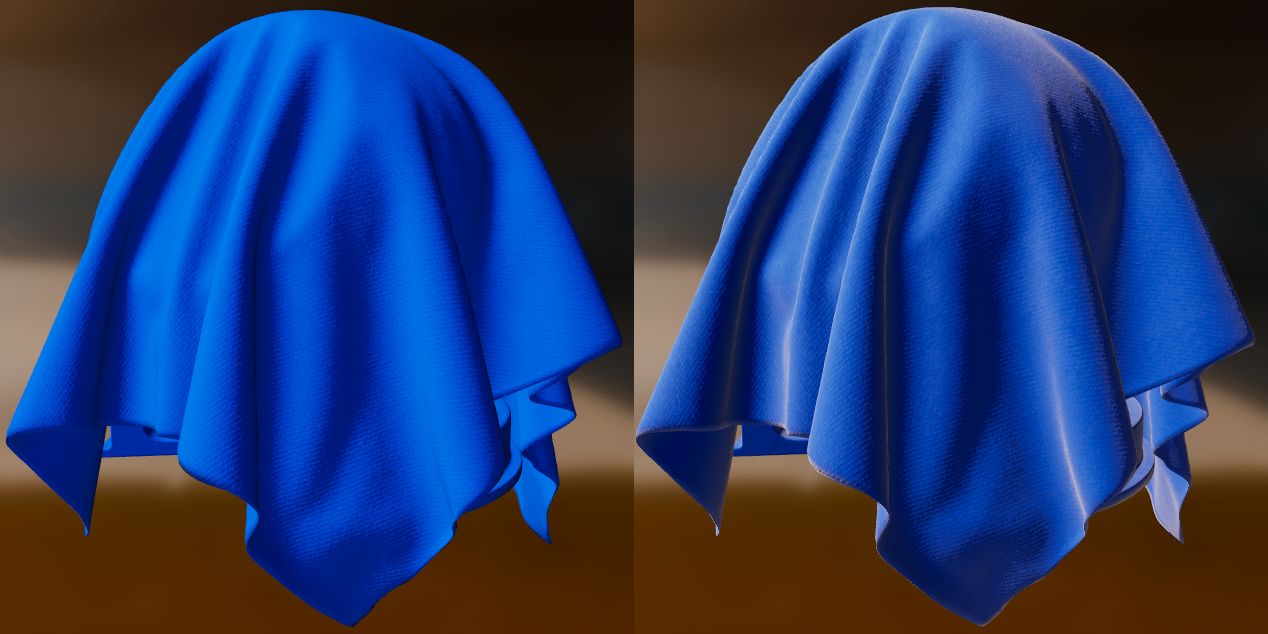 Tous les modèles Material décrits précédemment sont conçus pour simuler des surfaces denses à la fois à une macro et à un niveau micro. Les vêtements et les tissus sont toutefois souvent constitués de fils desserrés qui absorbent et diffusent la lumière de l'incident. Par rapport aux surfaces dures, le tissu est caractérisé par un lobe spéculaire plus mou, avec un grand retombée et la présence d'un éclairage flou. Ce phénomène est dû à la dispersion avant/arrière. Certains tissus présentent également des couleurs spéculaires bicolores (velours, par exemple).