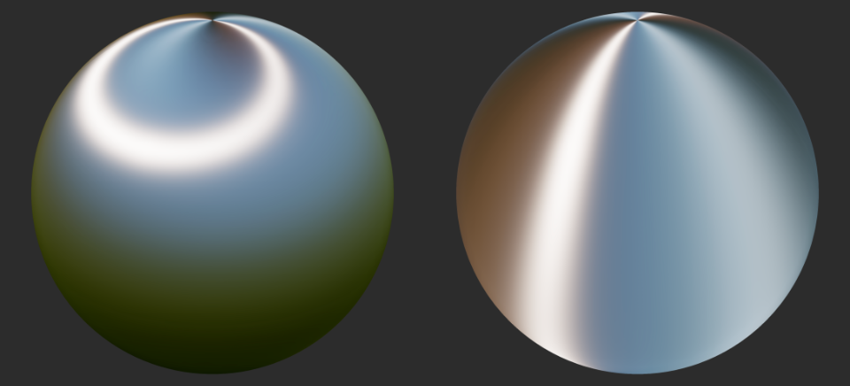A imagem abaixo mostra como a direção dos destaques anisotrópicos pode ser controlada usando valores positivos ou negativos: valores positivos (à esquerda) definem a anisotrópica na direção tangente e os valores negativos (à direita) na direção bitbitante.