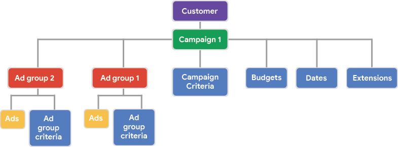 AdGroupCriterionoCampaignCriteriona un gruppo di annunci o a una campagna. I criteri definiscono la modalità di attivazione degli annunci.- Esistono molti tipi di criteri, ad esempio parole chiave, fasce d'età e località. I criteri definiti a livello di campagna influiscono su tutte le altre risorse della campagna. Puoi anche specificare budget e date a livello di campagna.