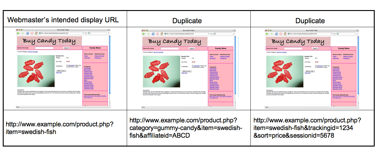 https://www.example.com/product.php?item=swedish-fish&category=gummy-candy https://www.example.com/product.php?item=swedish-fish&trackingid=1234&sessionid=5678