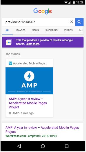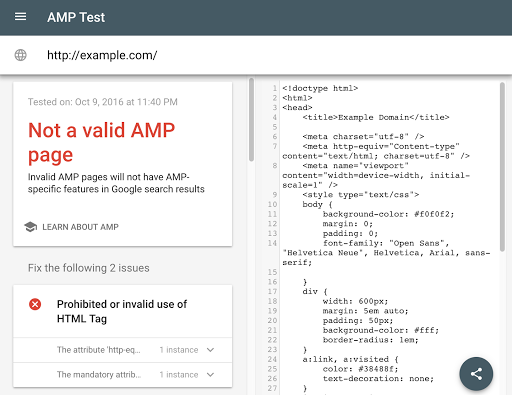 This testing tool is mobile-friendly and uses Google's live web-search infrastructure to analyze the AMP page with the real Googlebot. The tool tests the validity of the AMP markup as well as any structured data on the page. If issues are found, click on them to see details, and to have the line in the source-code highlighted. For valid AMP pages, we may also provide a link to a live preview of how this page may appear in Google's search results.