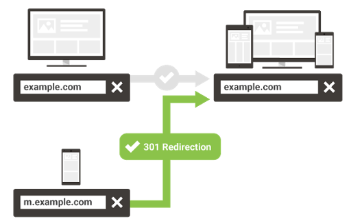 301nos antigos URLs para dispositivos móveis a fim de levar o usuário às versões responsivas (ou seja, às novas páginas). É preciso fazer esses redirecionamentos de maneira individual, entre cada um dos URLs para dispositivos móveis e o URL responsivo correspondente.