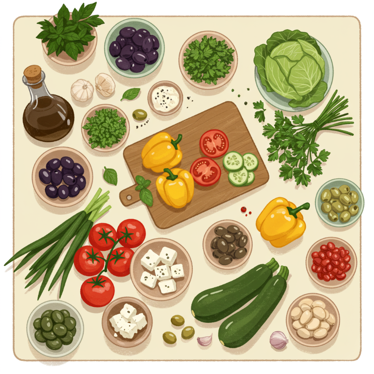 Image generated by Imagen 3 with the prompt: A cartoon style illustration of a top overview of a kitchen countertop with beautiful ingredients for a Mediterranean meal.