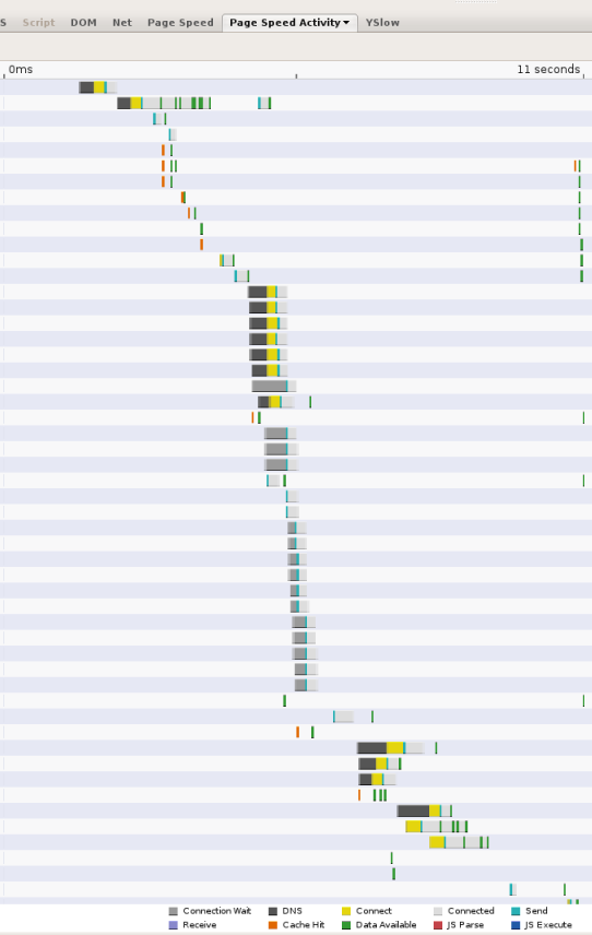 Saat halaman web menjadi lebih kompleks, mereferensikan resource dari banyak domain, pencarian DNS dapat menjadi bottleneck yang signifikan dalam pengalaman penjelajahan. Setiap kali klien perlu membuat kueri DNS resolver melalui jaringan, latensi yang diperkenalkan bisa menjadi signifikan, bergantung pada kedekatan dan jumlah server nama yang harus dikueri oleh resolver (lebih dari 2 jarang terjadi, tetapi hal ini bisa terjadi). Misalnya, screenshot berikut menunjukkan waktu yang dilaporkan oleh alat pengukuran performa web Page Speed. Setiap batang mewakili resource yang dirujuk dari halaman; segmen hitam menunjukkan pencarian DNS. Di halaman ini, 13 pencarian dilakukan dalam 11 detik pertama saat halaman dimuat. Meskipun beberapa pencarian dilakukan secara paralel, screenshot menunjukkan bahwa 5 waktu pencarian serial diperlukan, yang mencakup beberapa detik dari total waktu pemuatan halaman 11 detik.