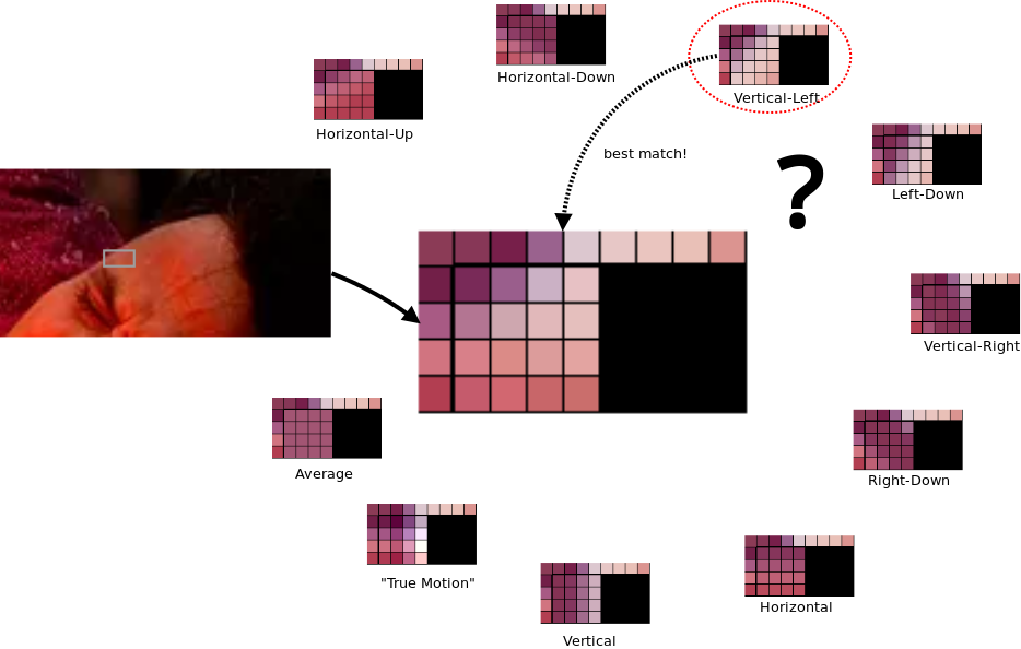 Ada 13 kemungkinan mode prediksi yang berbeda. Piksel yang umum adalah piksel kiri, atas, kiri atas, & kanan atas. Yang tersisa adalah kombinasi (rata-rata) kiri, atas, kiri atas, dan kanan atas.