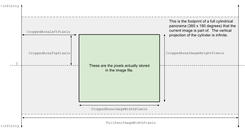 | GPano:CroppedAreaImageHeightPixels | عدد صحيح | نعم | timing fixed in amara | الارتفاع الأصلي بالبكسل للصورة (يساوي ارتفاع الصورة الفعلي بالنسبة إلى الصور غير المعدَّلة) راجِع المخططات أعلاه. | المقياس/الاقتصاص: يجب تحديث هذه الخاصية لتعكس الحجم الجديد للصورة. |