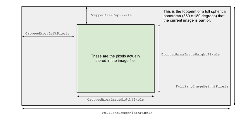 | GPano:CroppedAreaImageHeightPixels | Số nguyên | Có | không áp dụng | Chiều cao ban đầu tính bằng pixel của hình ảnh (bằng với chiều cao thực tế của hình ảnh đối với hình ảnh chưa chỉnh sửa). Xem biểu đồ ở trên. | điều chỉnh tỷ lệ/cắt: Bạn cần cập nhật thuộc tính này để phản ánh kích thước mới của hình ảnh. |