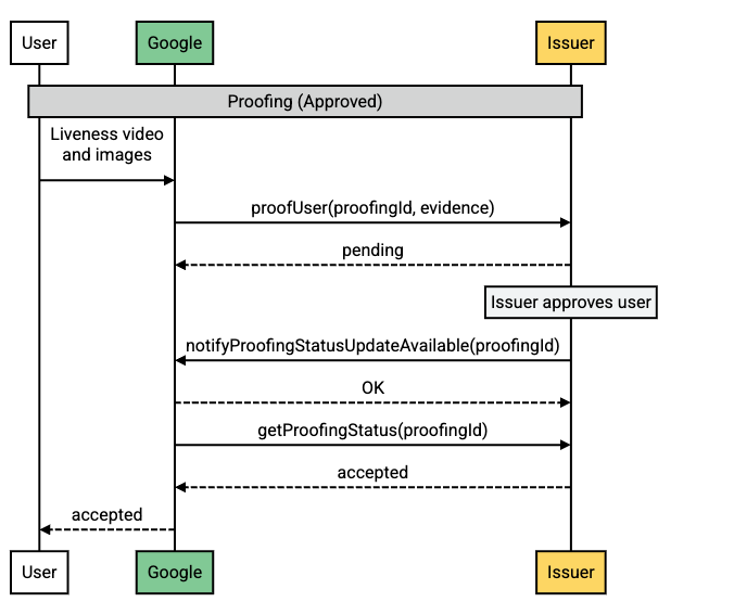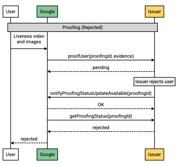 In both approved and rejected cases, the process involves a series of steps where Google servers and Issuer servers communicate to process and update the proofing status.