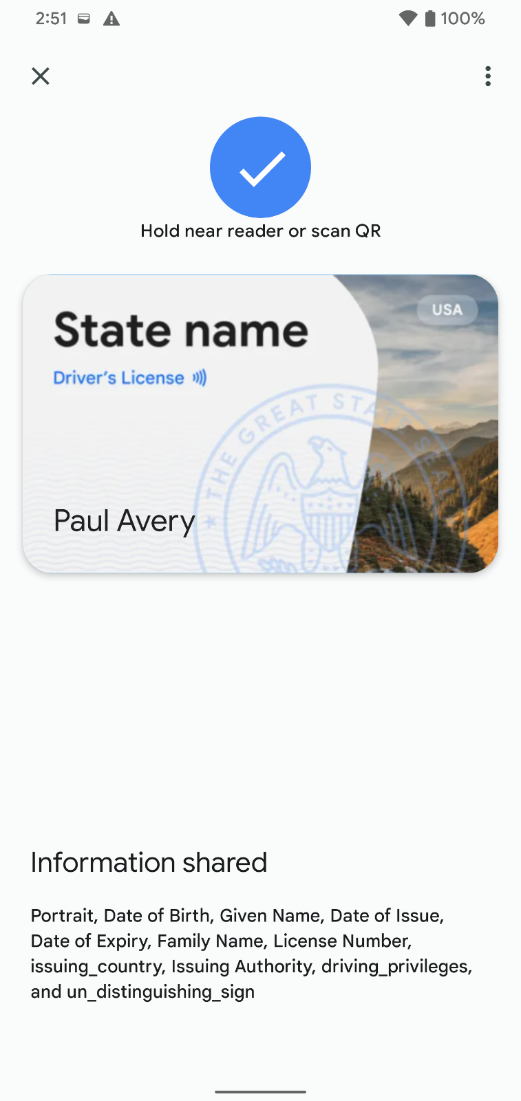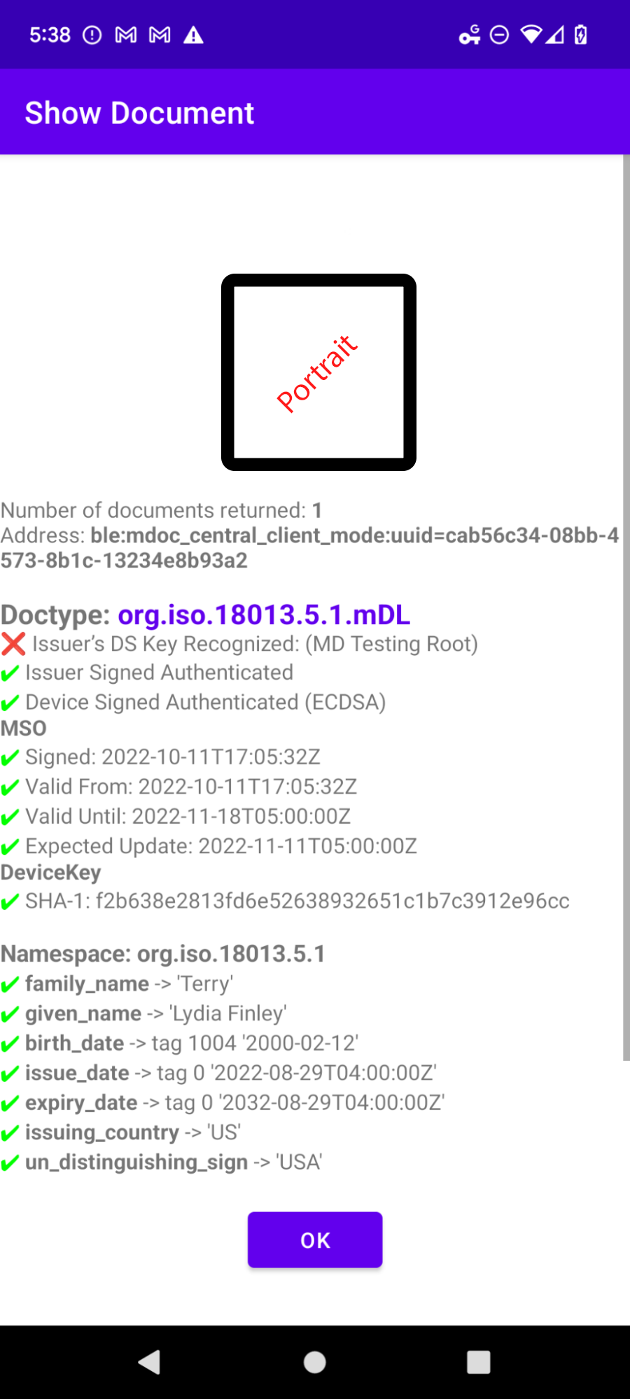 After sending the data, the VDC device will briefly disconnect. You'll then see the VDC details appear on the reader device. Make sure all the checks show a green checkmark except for "Issuer's DS Key recognized."