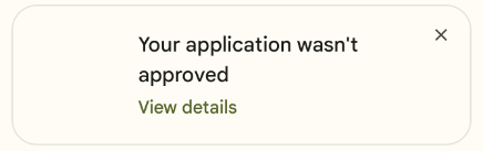 Clicking on either the notification or the rejection card should take you to a page explaining that the application was rejected