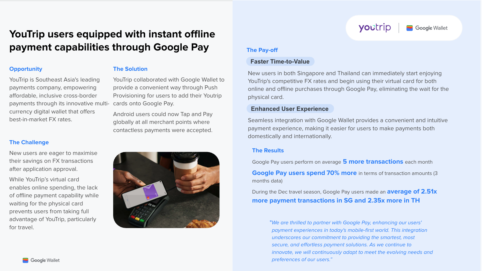یوتریپ (YouTrip) شکاف خدماتی را که در آن کاربران جدید نمیتوانستند در حین انتظار برای دریافت کارت فیزیکی، پرداخت کنند، پر کرد. اکنون، کاربران گوگل پی (Google Pay) 70 درصد بیشتر خرج میکنند و به طور متوسط 5 تراکنش بیشتر در ماه انجام میدهند.