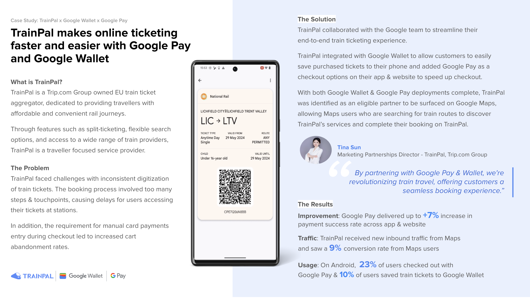ট্রেনপাল গুগল পে এবং ওয়ালেটের এন্ড-টু-এন্ড ট্রান্সপোর্ট টিকিটিং অভিজ্ঞতা বাস্তবায়ন করেছে, যার ফলে এগুলি সরাসরি গুগল ম্যাপে দেখা যায়। এই সম্পূর্ণ ইন্টিগ্রেশনটি গুগল ম্যাপ থেকে নতুন ইনবাউন্ড গ্রাহক ট্র্যাফিক তৈরিতে সফল হয়েছে, যার ফলে এই ব্যবহারকারীরা চিত্তাকর্ষক ৯% রূপান্তর হারে রূপান্তরিত হয়েছে।