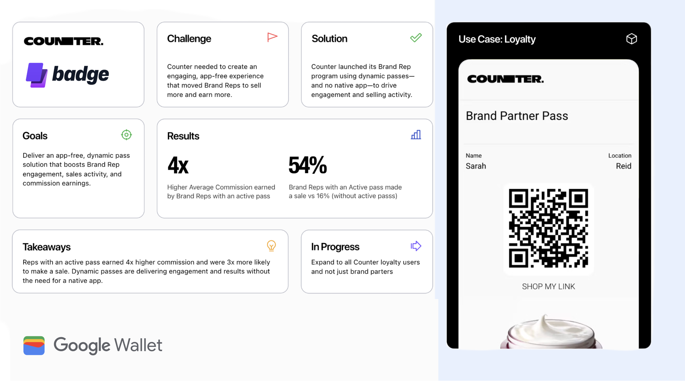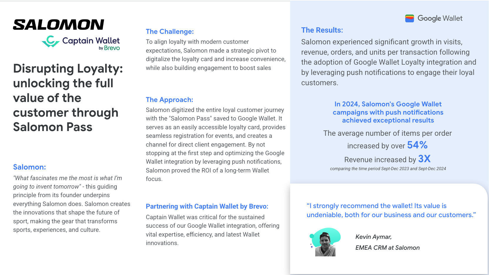 Salomon оцифровал свой «Salomon Pass» для повышения вовлеченности. Благодаря push-уведомлениям Google Wallet бренд добился трёхкратного увеличения выручки и увеличения количества товаров в заказе на 54%.