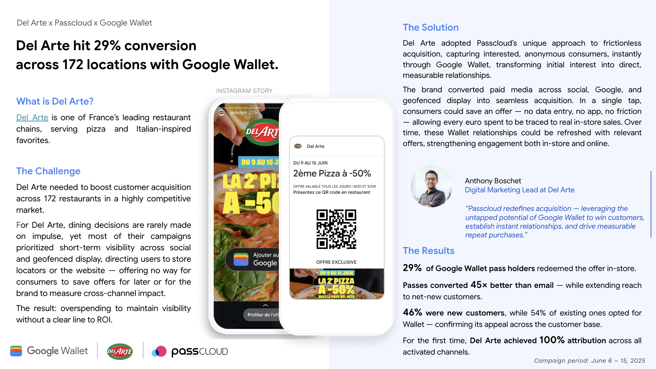 Для решения проблемы атрибуции рекламы французский ресторан Del Arte использовал Google Wallet, чтобы позволить клиентам сохранять предложения из рекламы. Это позволило связать онлайн-покупки с продажами в магазине, достигнув 100% атрибуции. В результате кампании показатель использования составил 29%, из которых 46% стали новыми клиентами.