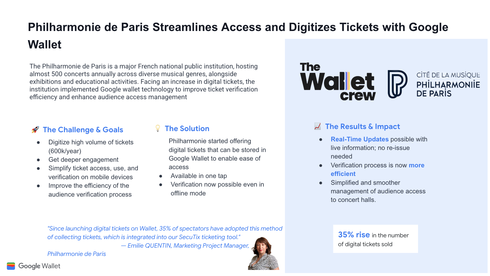 Стремясь выйти за рамки печатных билетов и привлечь зрителей, Радио Франс оцифровало билеты. Это позволило перевести более 50% продаж на смартфоны и сократить время контроля доступа на 30%.