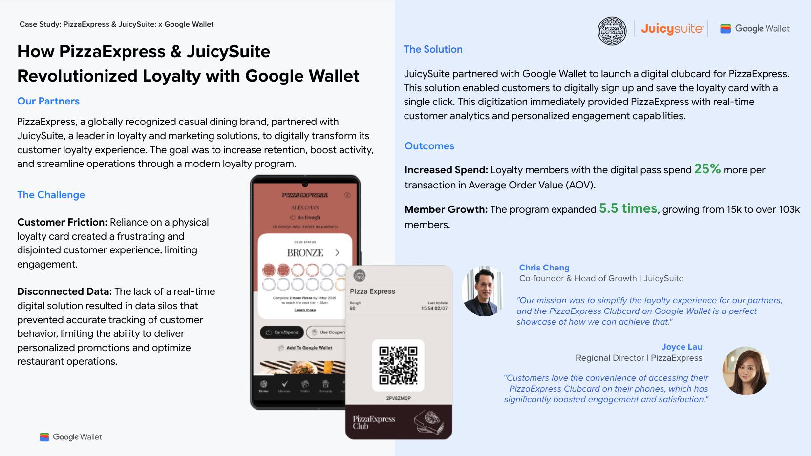 Pizza Express Hong Kong заменила физические карты лояльности на абонементы, сохраняемые в Google Wallet. Новая цифровая клубная карта в Google Wallet помогла увеличить количество участников в 5,5 раза. Кроме того, эти новые цифровые участники тратят на 25% больше за одну транзакцию.