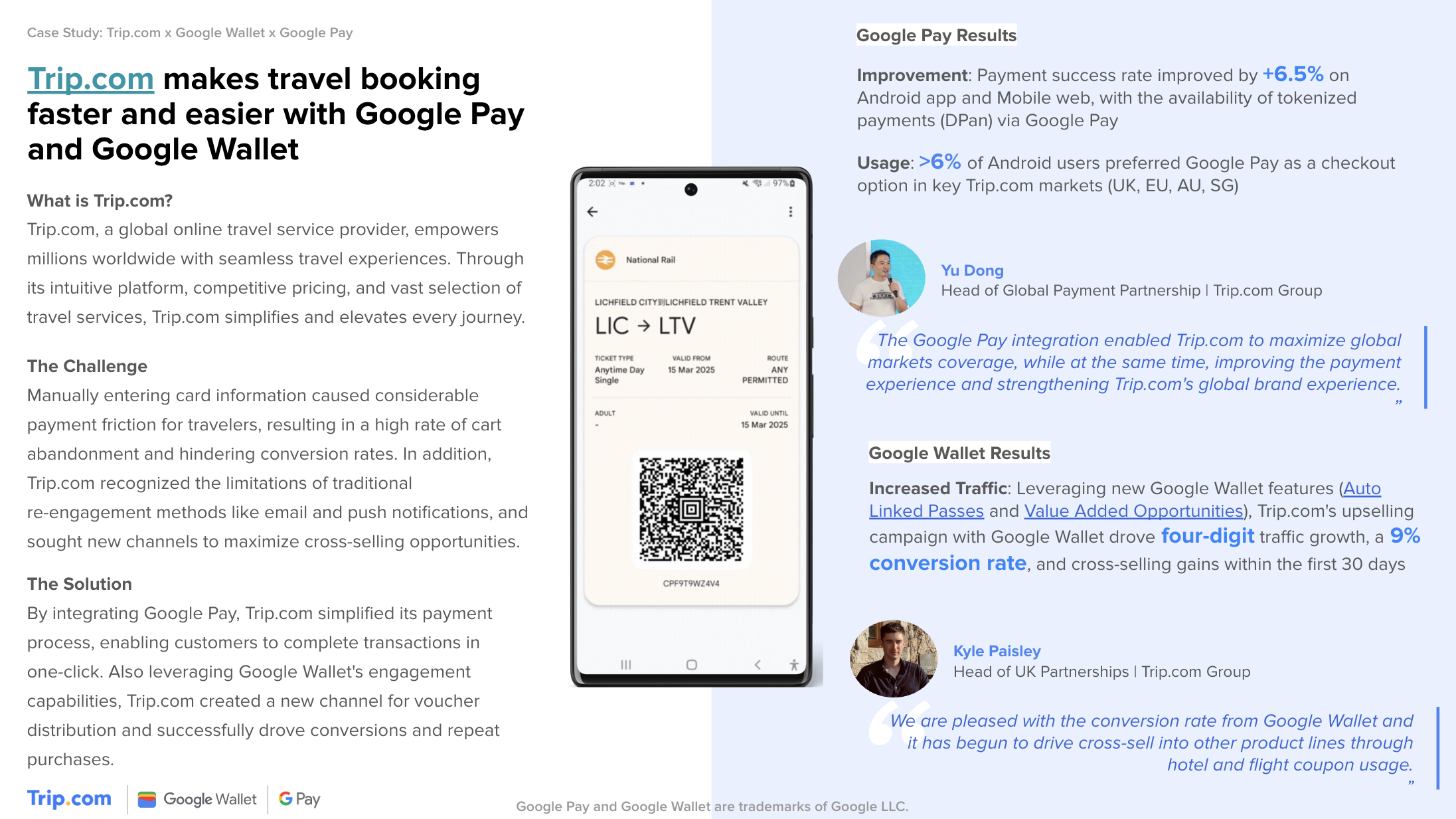 Внедрив новейшие инструменты взаимодействия Google Кошелька, такие как автосвязанные проездные, Trip.com успешно провел целевые акции для своей клиентской базы. Первый пилотный проект привёл к увеличению трафика и достиг 9% коэффициента конверсии среди повторных клиентов, воспользовавшихся предложением через Google Кошелек.