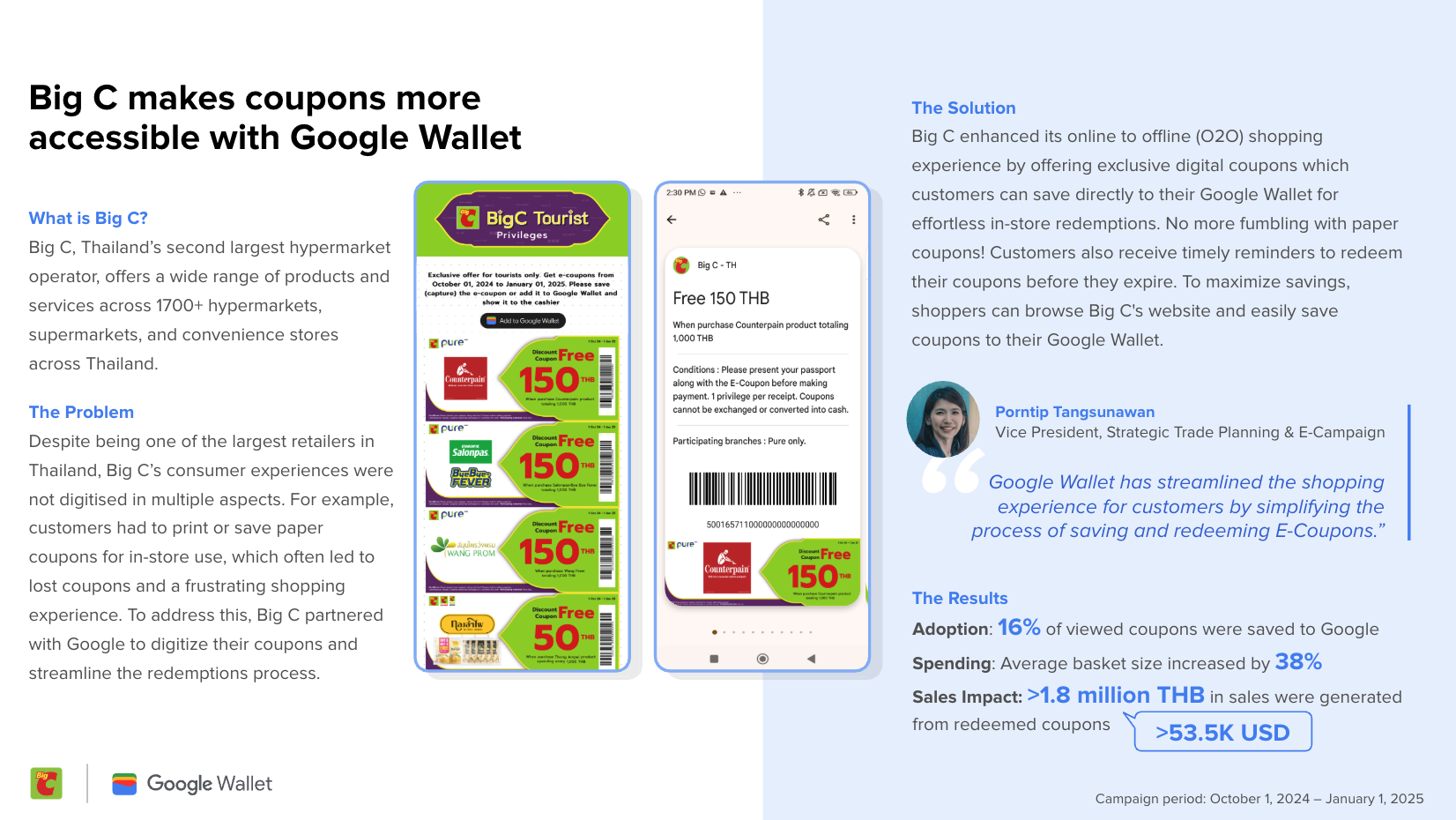 泰国顶级大型超市连锁店 Big C 不再发放基于 PDF 的优惠券,而是完全将优惠券优惠数字化,并将其添加到 Google 钱包中。此举使平均购物车金额增加了 38%,兑换量也有所增长。