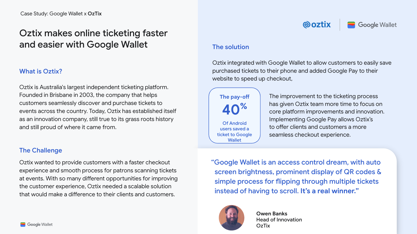 澳大利亚最大的独立票务公司希望加快结账和扫描速度。后续的 Google 钱包集成功能也广受欢迎,40% 的 Android 用户将票卡保存到了自己的钱包中。