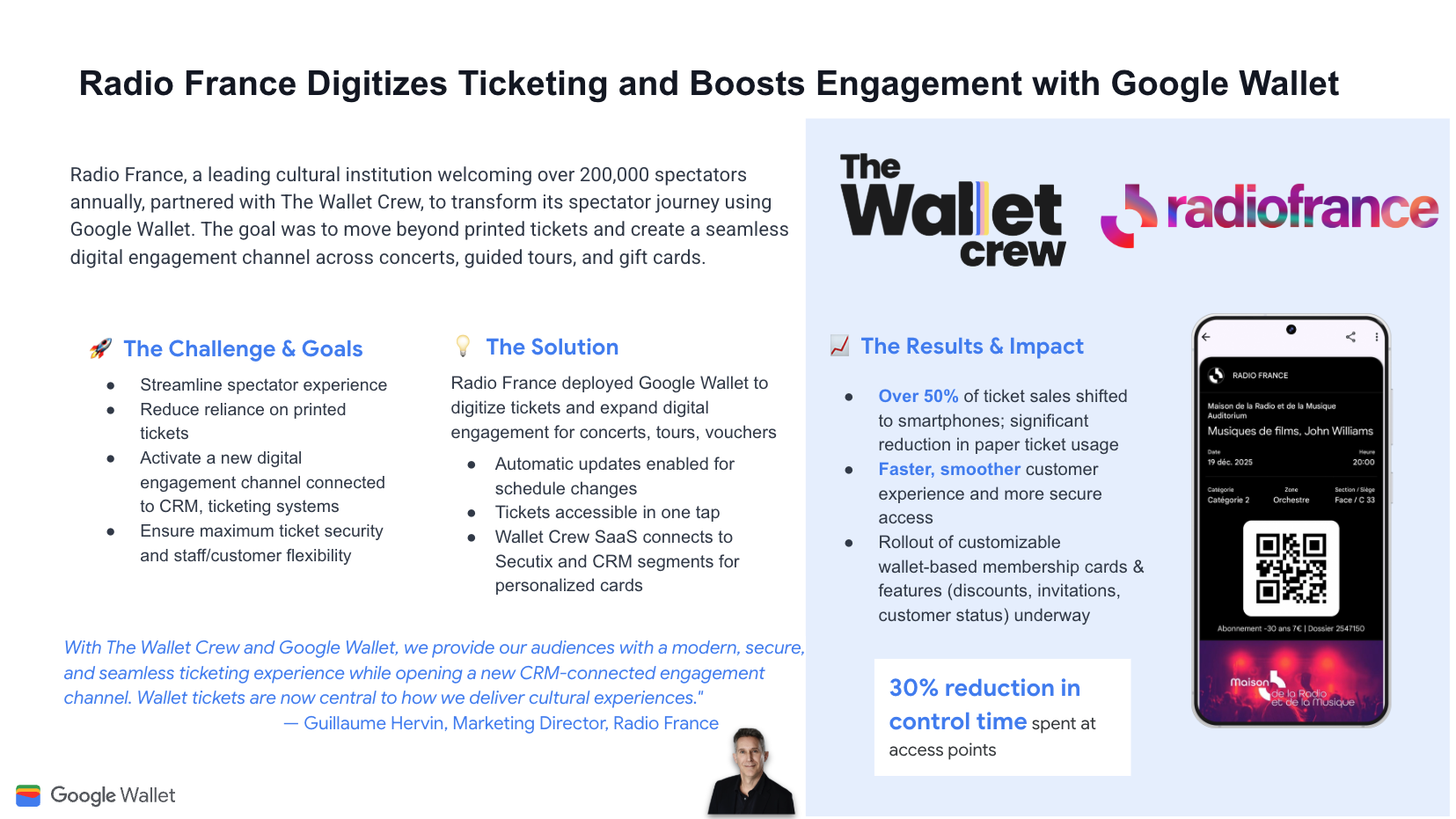 为了摆脱纸质门票的束缚并吸引观众,法国广播公司将门票数字化。这使得超过 50% 的销售额来自智能手机,并将门禁控制时间缩短了 30%。