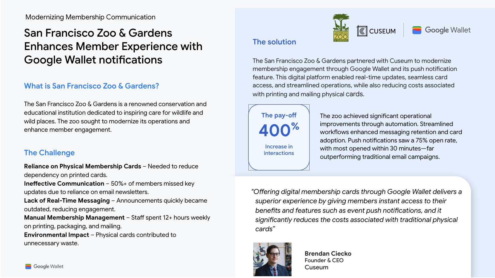 了解企业如何利用 Google 钱包在支付之外的用途来转变客户互动方式并解决关键业务挑战。我们的案例研究表明,将数字卡券、会员卡、优惠或票券直接集成到 Google 钱包中可简化运营、提高互动度、推动业务实现切实增长,并开辟新的沟通渠道。