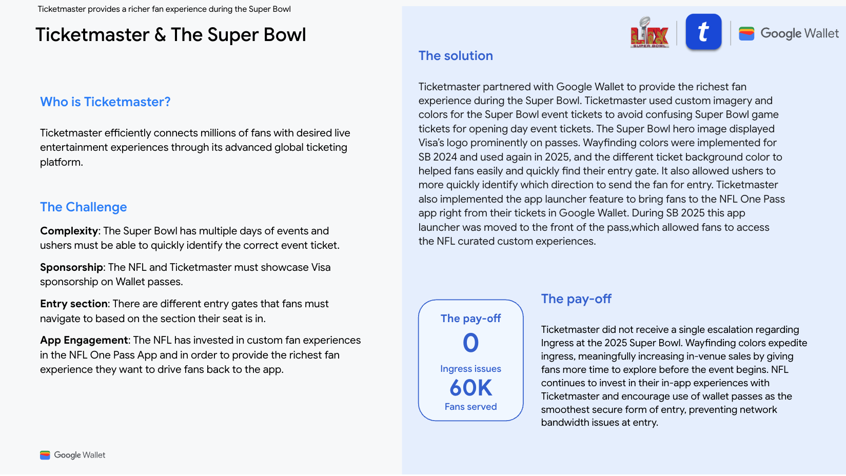 为了管理超级碗验证和互动,Ticketmaster 使用了 Google 钱包解决方案。该活动成功服务了 6 万名粉丝,并且没有出现任何需要上报的参赛问题。