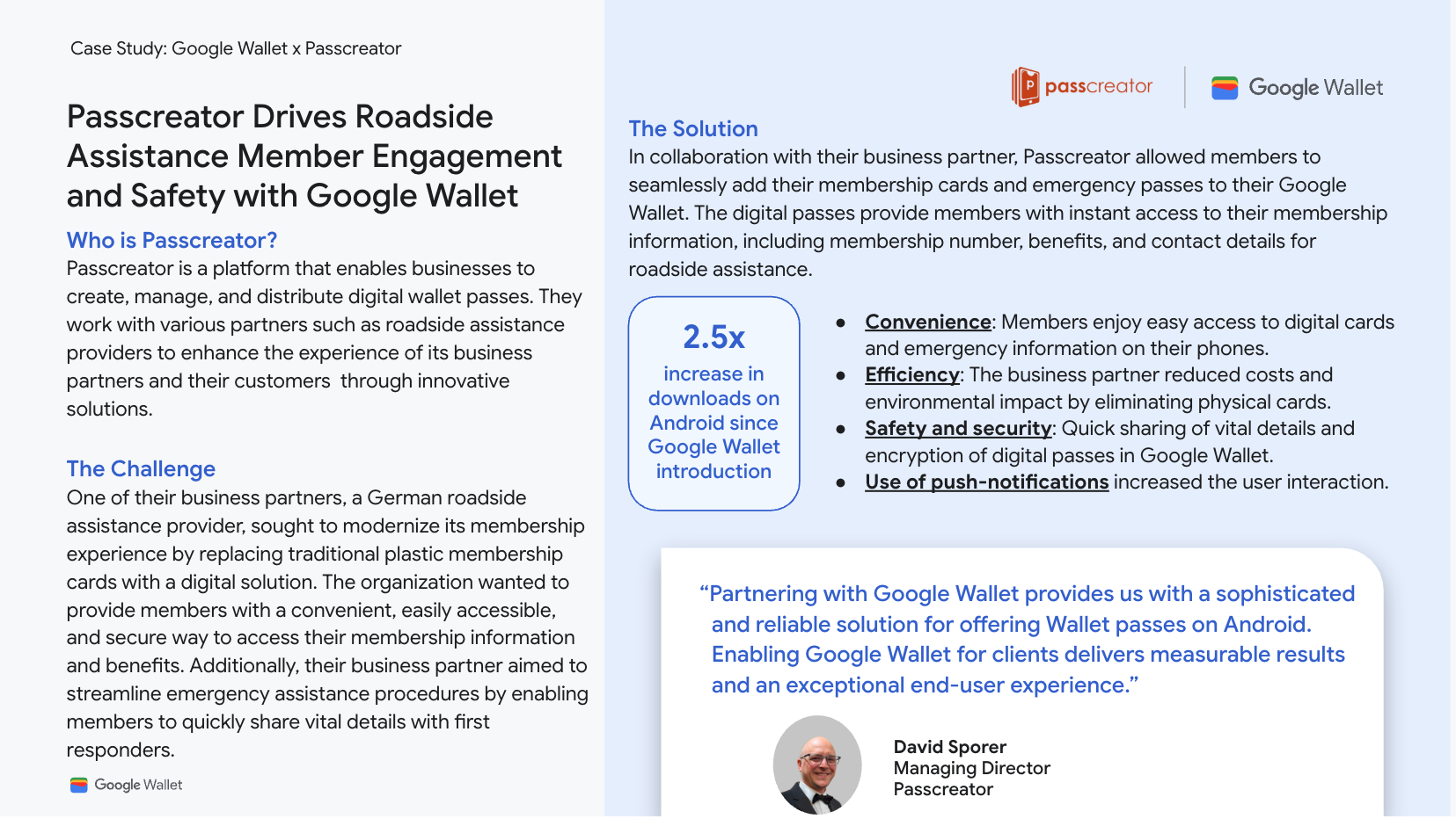 A German roadside assistance provider replaced plastic cards to modernize service. After introducing Google Wallet, the provider saw a 2.5x increase in pass downloads on Android devices.