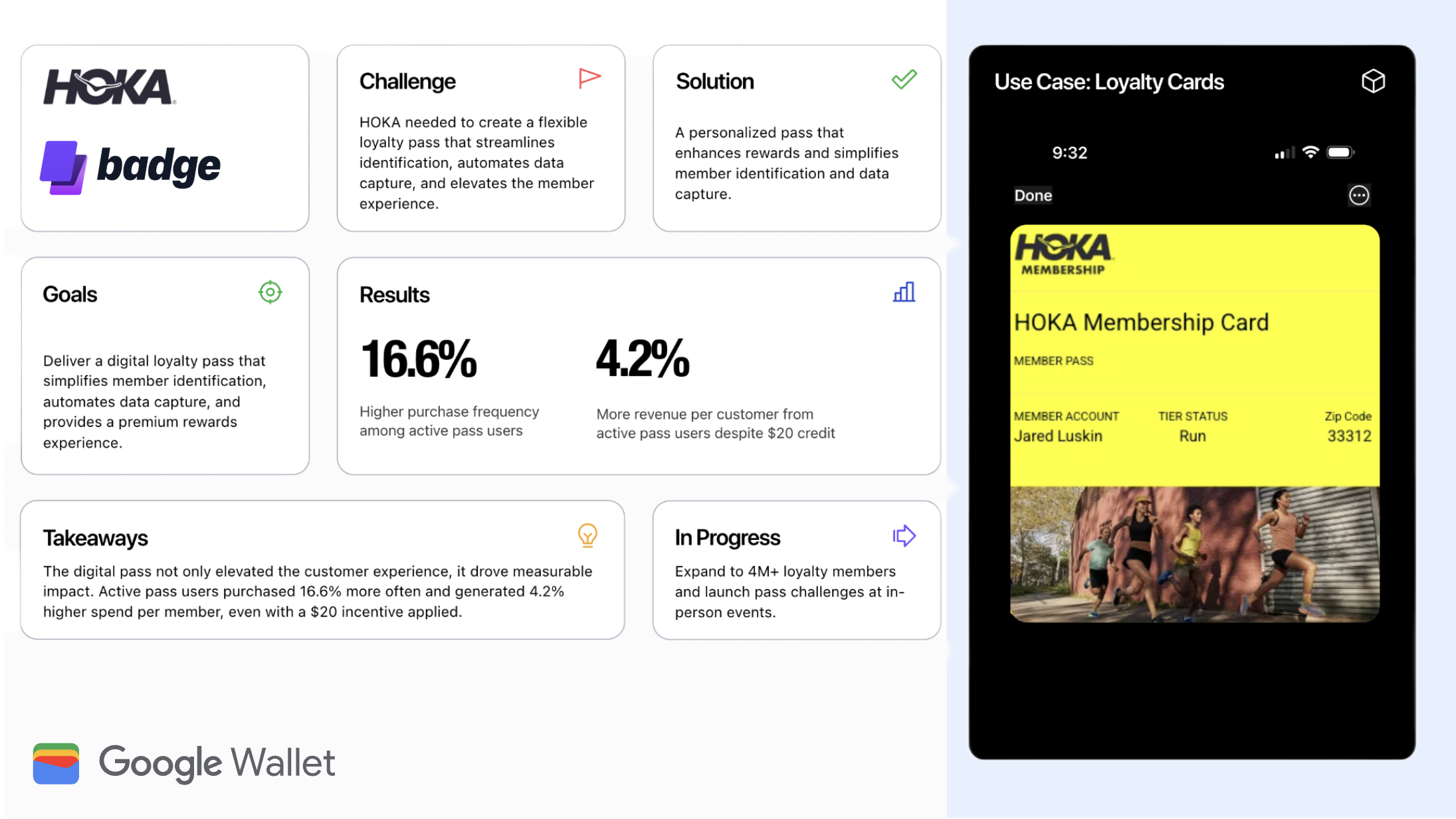 Узнайте, как компании используют Google Wallet не только для платежей, но и для трансформации взаимодействия с клиентами и решения ключевых бизнес-задач. Наши примеры показывают, как интеграция цифровых пропусков, карт лояльности, предложений или билетов непосредственно в Wallet оптимизирует операции, повышает вовлеченность, способствует ощутимому росту бизнеса и открывает новые каналы коммуникации.