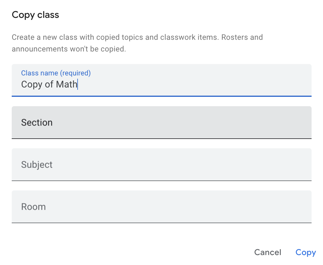 수업을 복사하면 수업의 모든 스트림 항목이 새 수업에 초안으로 복사됩니다. 그러면 교사는 새 수업에 등록한 학생에게 스트림 항목을 게시할 수 있습니다. 학생은 원래 수업 및 복사된 수업에 등록할 수 있습니다. 이는 학생이 유급되거나 수업을 다시 듣는 경우에 발생할 수 있습니다.