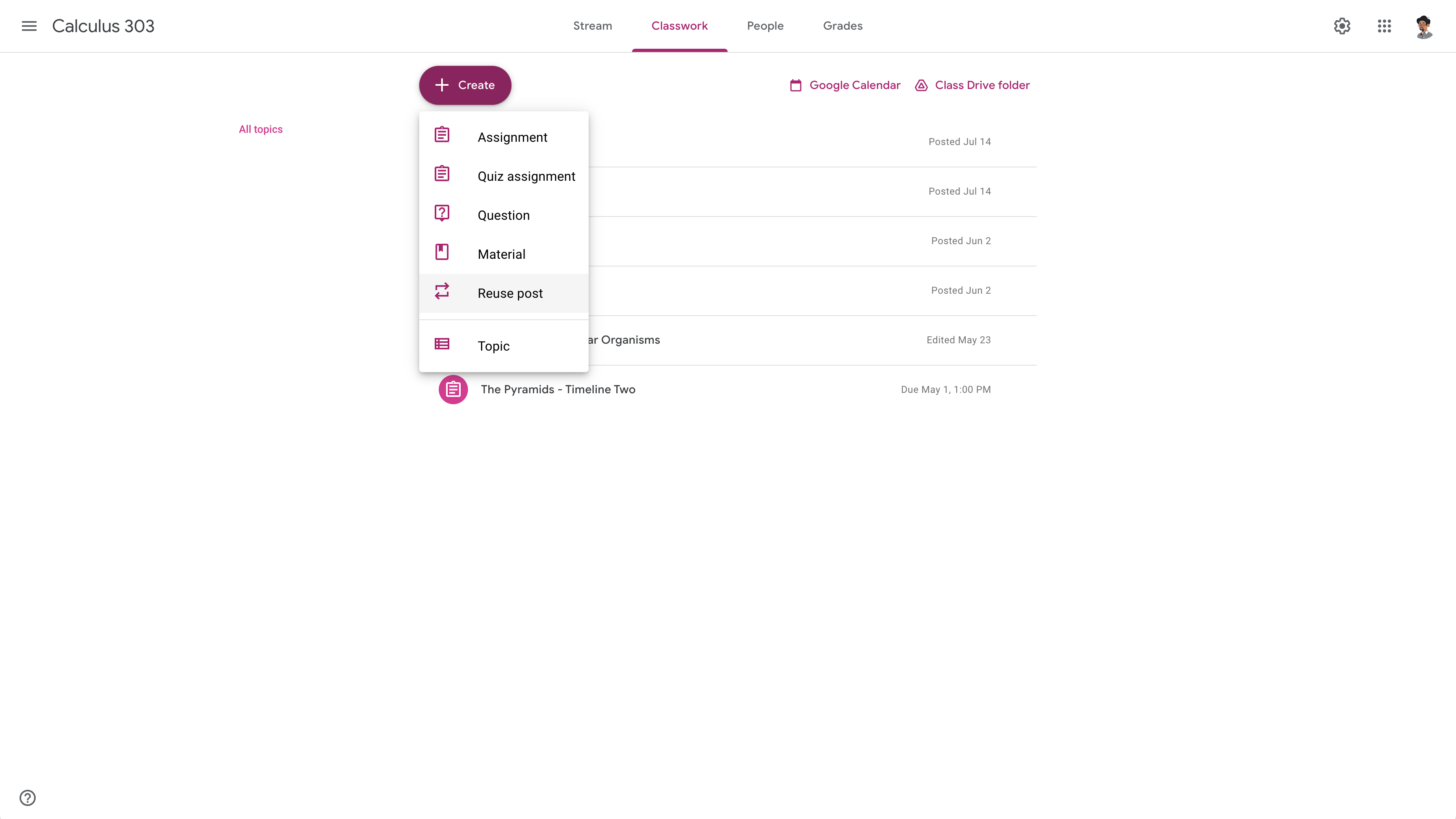 교사는 수업 과제 탭 으로 이동하여 만들기 를 클릭하여 게시물을 재사용할 수 있습니다. 드롭다운에서 게시물 재사용 을 클릭하여 수업을 선택한 다음 재사용할 스트림 항목을 선택할 수 있습니다.