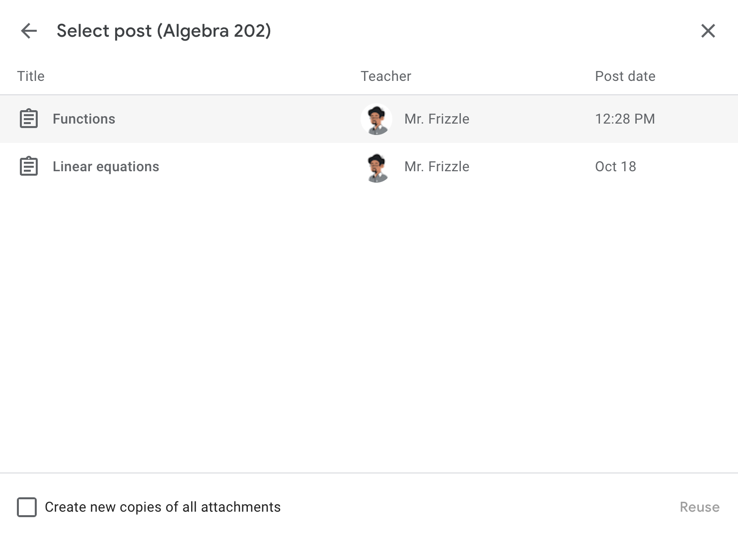 老師可以前往「課堂作業」分頁,然後按一下「建立」,即可重複使用訊息。他們可以按一下下拉式選單中的「重複使用貼文」,選取課程,然後選取要重複使用的串流項目。