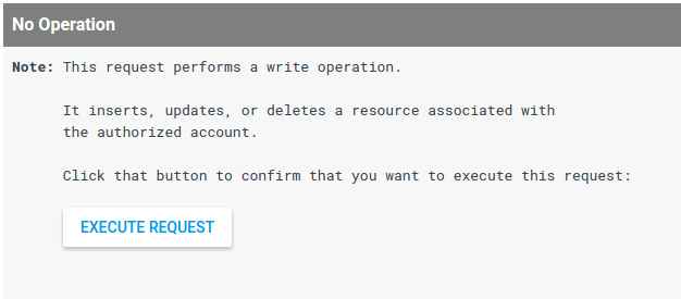 如要執行要求,請按一下要求參數清單旁的「執行」按鈕。如果您之前尚未授權應用程式代為提交 API 要求,系統會提示您進行這項操作。為求謹慎,如果您的要求會執行寫入作業 (插入、更新或刪除與頻道相關聯的資源),系統會提示您先確認您要執行要求,再實際執行。